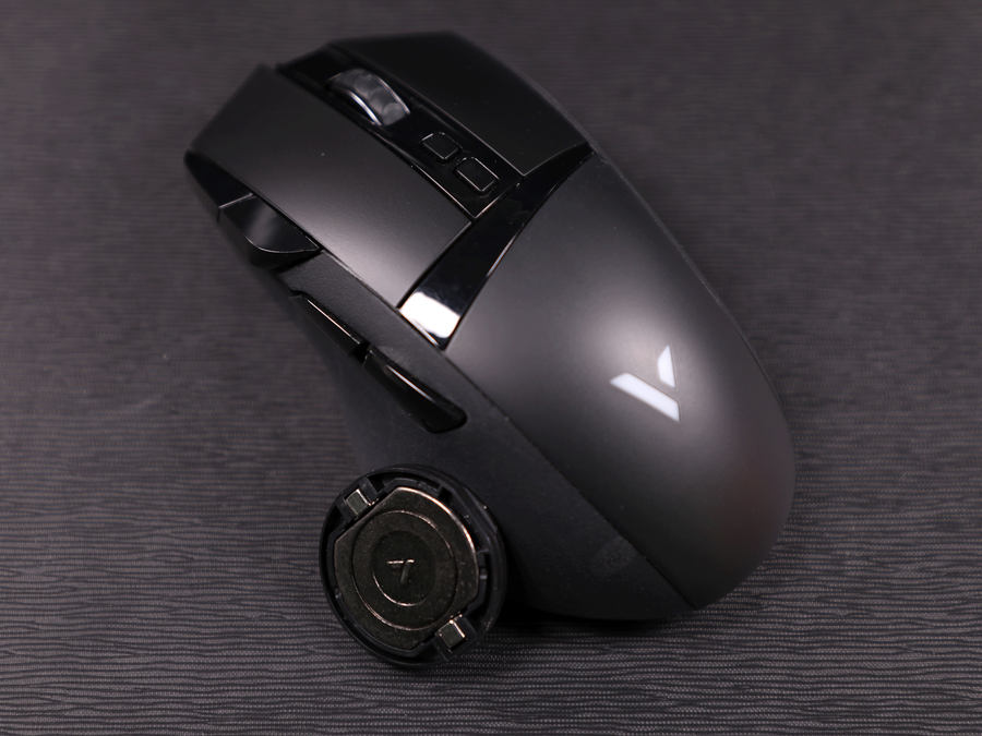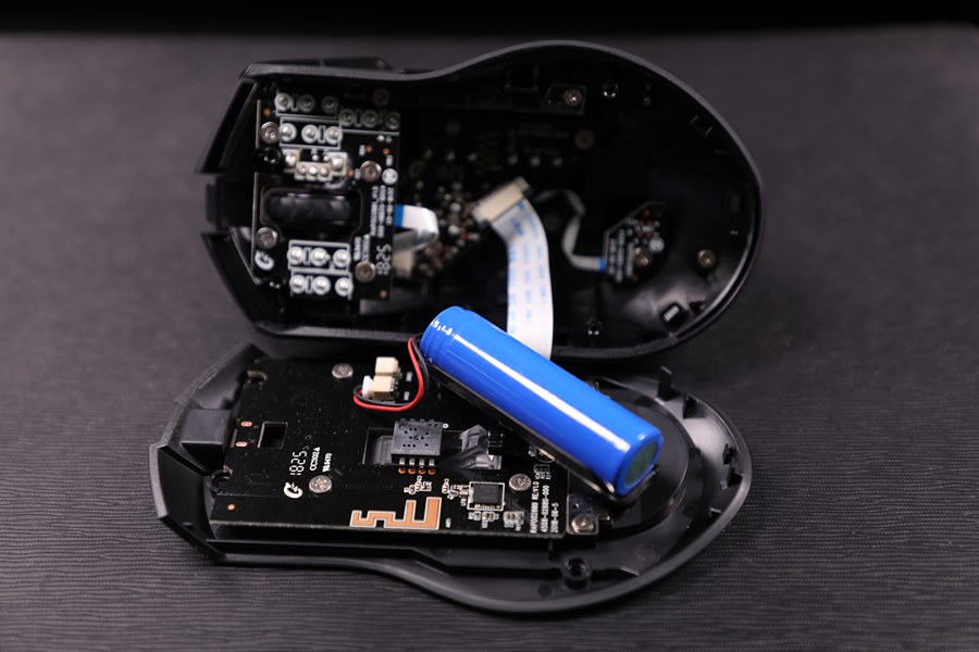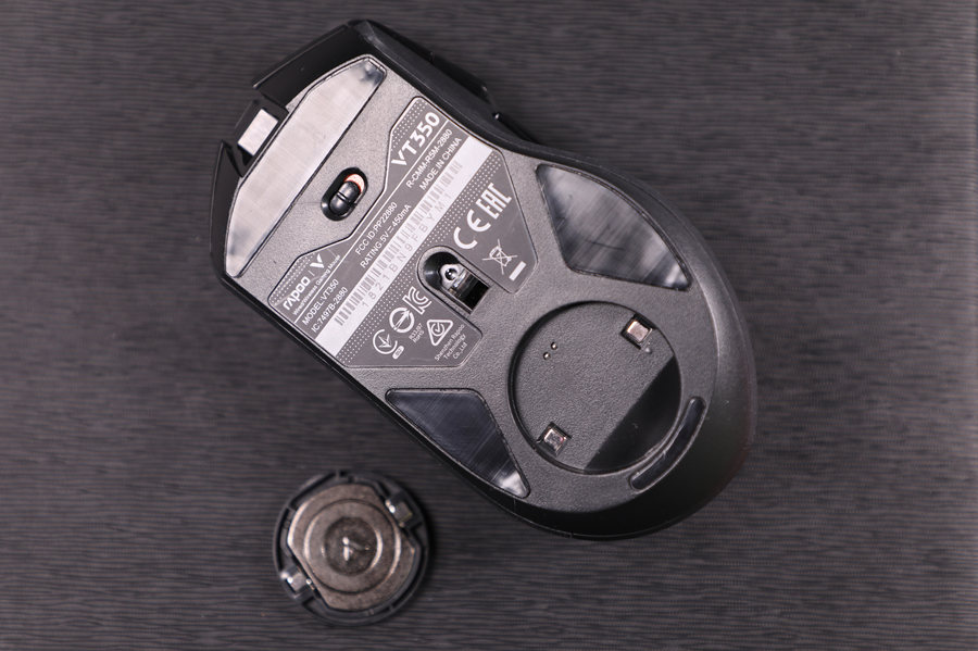 值得注意的是,由于鼠标分为上下两部分结构,中间通常会有软性排线相连,尽量避免生拉硬拽。另外,由于雷柏VT350是一款双模游戏鼠标,在鼠标内部虽然没有配有多余的配重块,但配有一块可循环充电电池(有增加配重的作用),为防止电池滑落,正面打开外壳是最稳妥的方式。