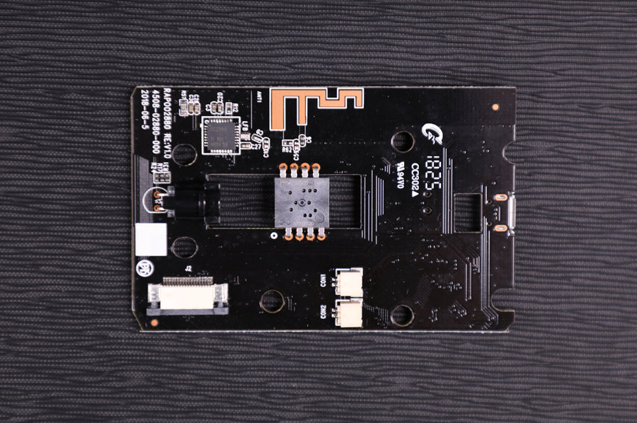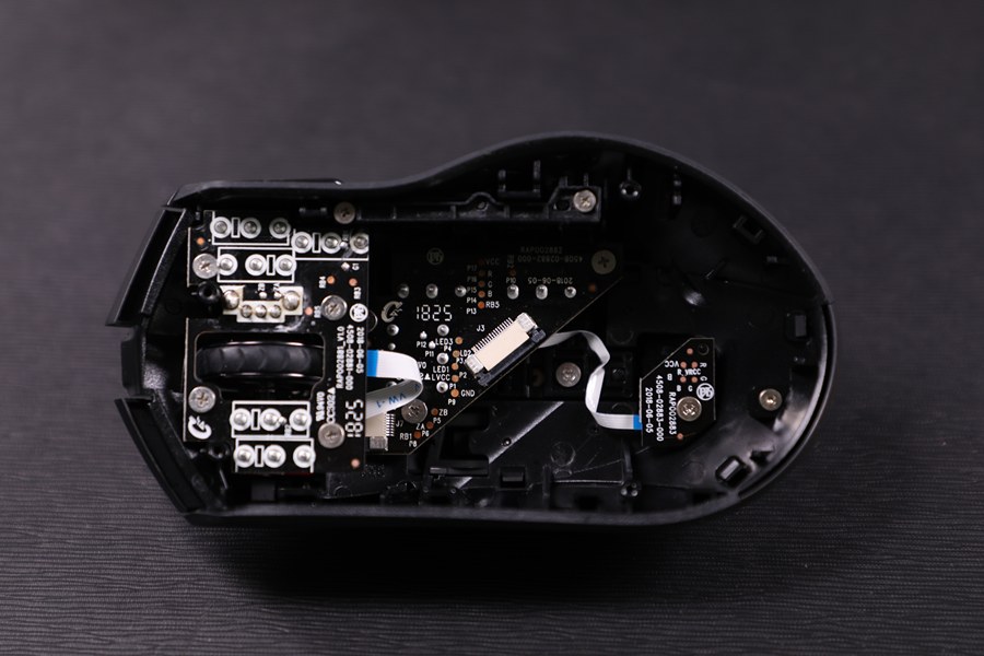 雷柏VT350出了底部的PCB大板外,在鼠标上盖内还有三块体积相对较小的PCB版,分别为微动控制器以及灯光模块。