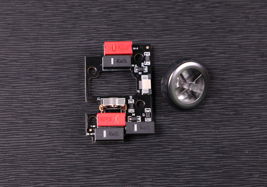 雷柏VT350拥有两个DPI按键,对应上盖内的PCB板可以发现,采用的同样为凯华白点微动。