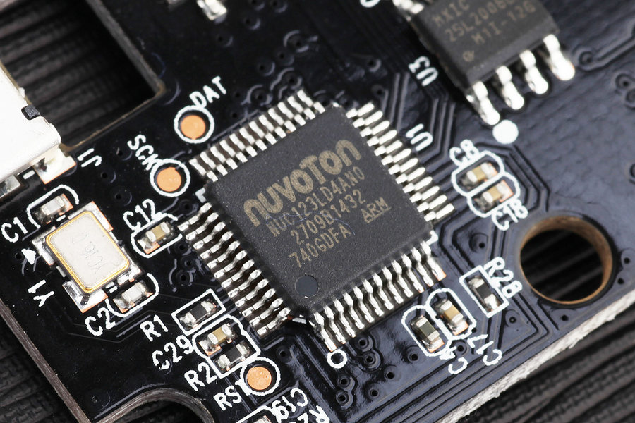 微控制器来自新唐科技,型号为NUC123LD4AN0,这颗ARM Cortex-M核心处理器主频速度为72MHz,能够满足鼠标在使用过程中处理各类移动信号。