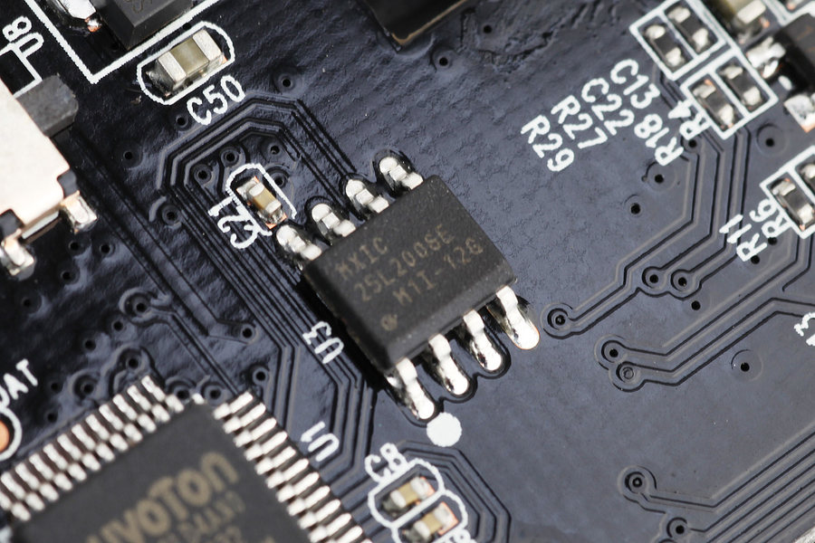 闪存使用的是旺宏电子的MX25L2006EM1I-12G,存储容量为2MB。速度为86MHz。