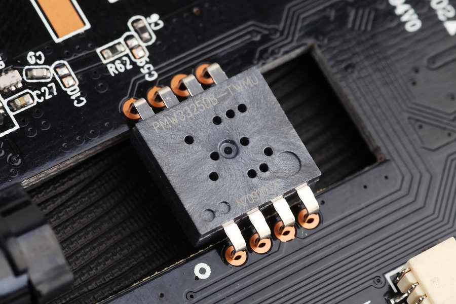 PCB板中心的光学引擎芯片上的标识显示这是一款采用原相 PMW3325DB 的芯片,可支持无线鼠标设备,因其拥有5000DPI,移动100IPS,20G的加速度而被外设厂商广泛应用于主流的中高端游戏鼠标,性能非常不错。