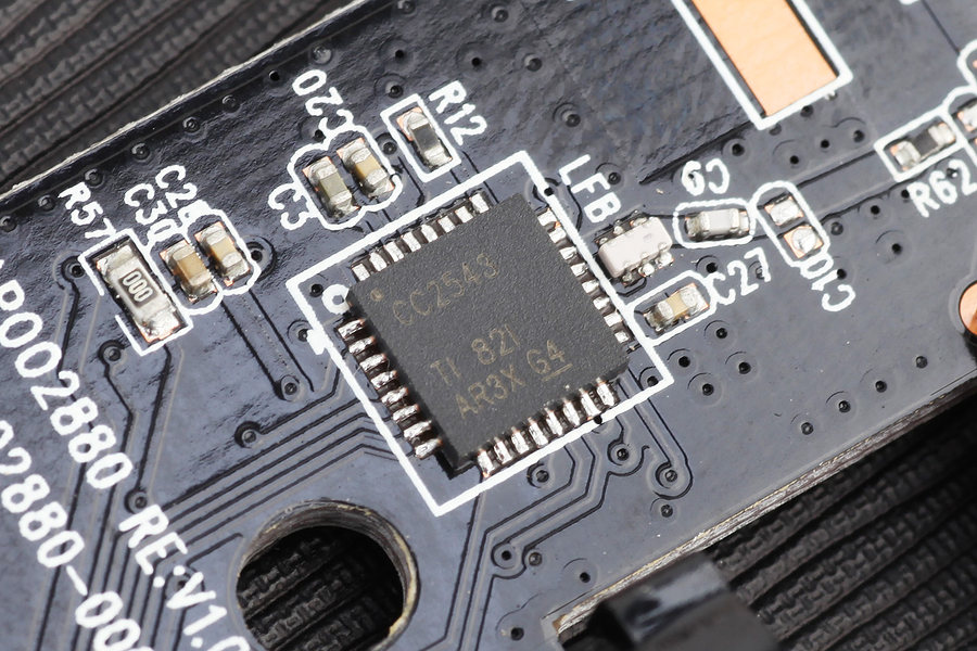 射频IC型号为CC2543,来自德州仪器,该元件能够保证数据速率高达2Mbps,支持 250kbps、500kbps、1Mbps和 2Mbps数据速率。CC2543芯片具有32KB闪存,能够满足无线数据传输过程中的稳定性和效率。